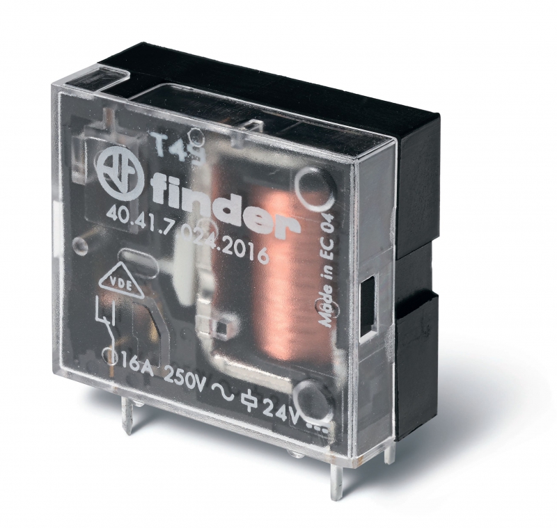 Миниатюрное универсальное электромеханическое реле, монтаж на печатную плату, выводы с шагом 3.5мм, 1CO 16A, контакты AgCdO, катушка 12В DC (чувствит.), степень защиты RTI | код 404170122016 | FINDER