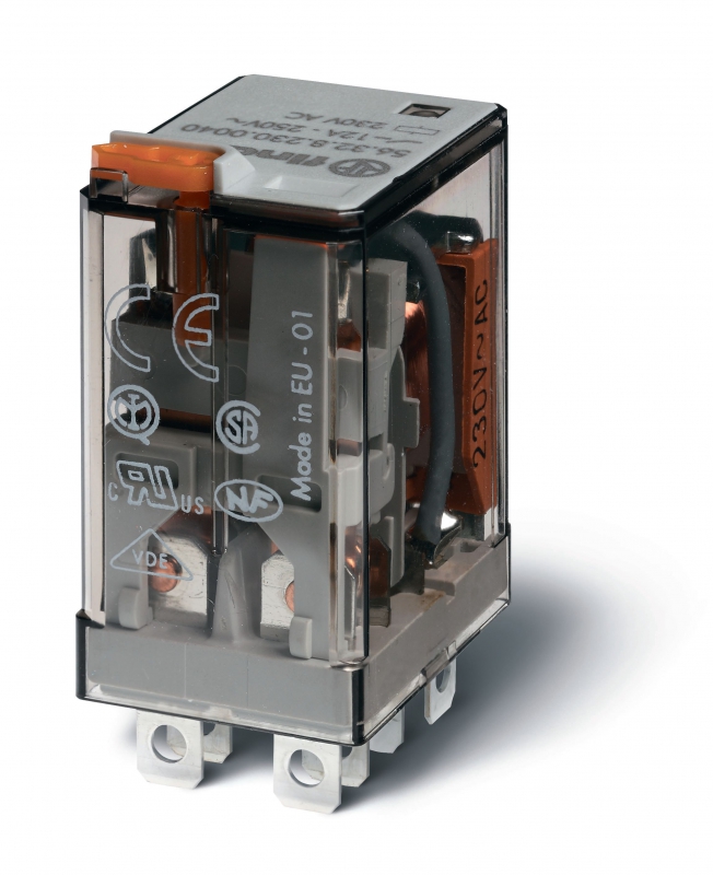 Миниатюрное силовое электромеханическое реле, монтаж в розетку или наконечники Faston (4.8х0.5мм), 2CO 12A, контакты AgCdO, катушка 24В АC, степень защиты RTI, опции: нет | код 563280242000 | FINDER