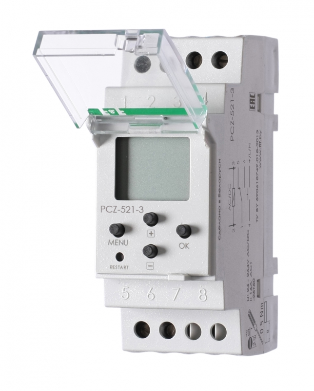 РЕЛЕ ВРЕМЕНИ ПРОГРАММИРУЕМЫЕ PCZ-521-3 NEW! Одноканальное, 250 пар вкл./выкл., суточный и недельный циклы работы, со входом управления, с функцией NFC, 2 модуля, монтаж на DIN-рейку 24-264 В AC/DC 16А 1NO/NC IP20 | код EA02.002.018 | ЕВРОАВ