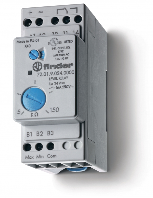 Реле контроля уровня, настраиваемый диапазон чувствительности 5…450кОм, питание 240В AC, выход 1CO 16А, модульное, ширина 35мм, степень защиты IP20, упаковка 1шт. | код 720182400002PAS | FINDER