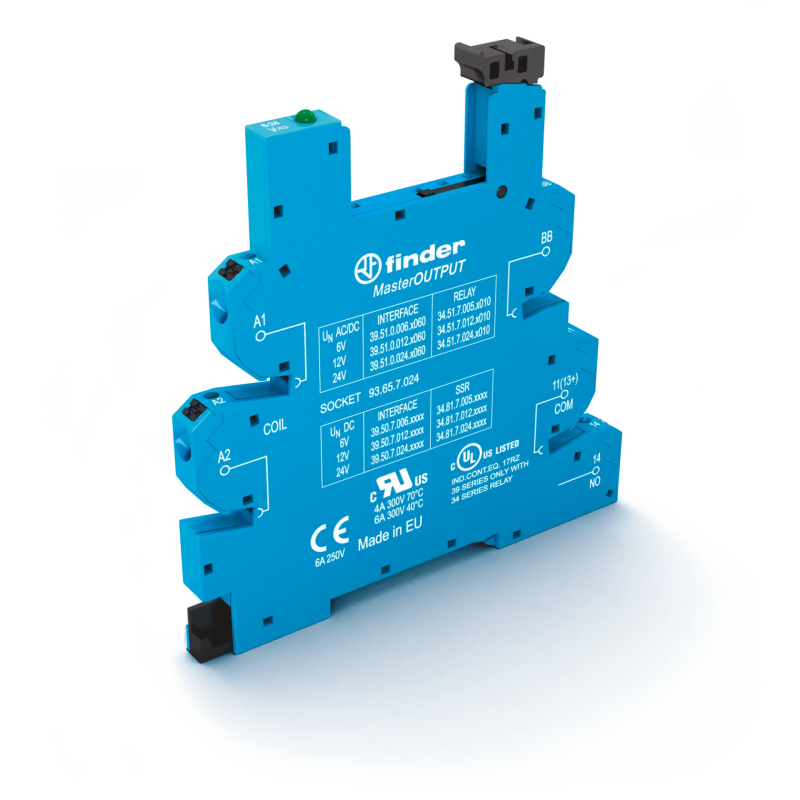 Розетка MasterOUTPUT с безвинтовыми клеммами Push-in для реле 34 серии, питание 230-240В АС, в комплекте пластиковая клипса, опции: LED | код 93658230 | FINDER
