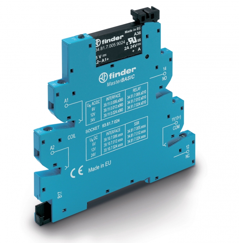 Интерфейсный модуль (сборка 34.81.7.060.9024 + 93.61.0.125), твердотельное реле, серия MasterBASIC, выход 6A (24В DC), питание 125В AC/DC, категория защиты IP20, винтовые клеммы | код 391001259024 | FINDER