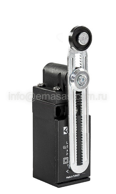Выключатель концевой синхроного переключения угловой 2-х направленный с металлической консолью и пластиковым роликом Ф18мм на длинном регулируемом рычаге (1НО+2НЗ), L3K25MEP123 | код L3K25MEP123 | EMAS