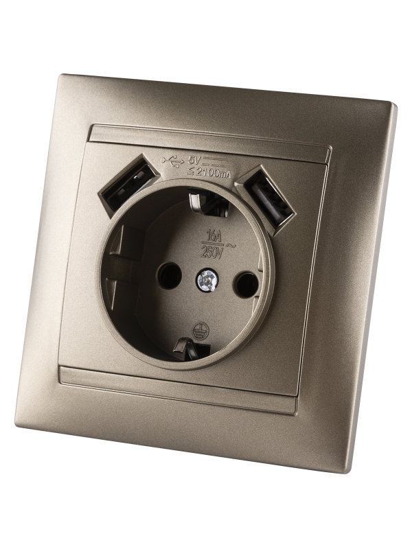 Розетка 2П+З 16А 250В + 2 USB порта 2,1А 5В бронза Лама TDM | код SQ1815-0742 | TDM