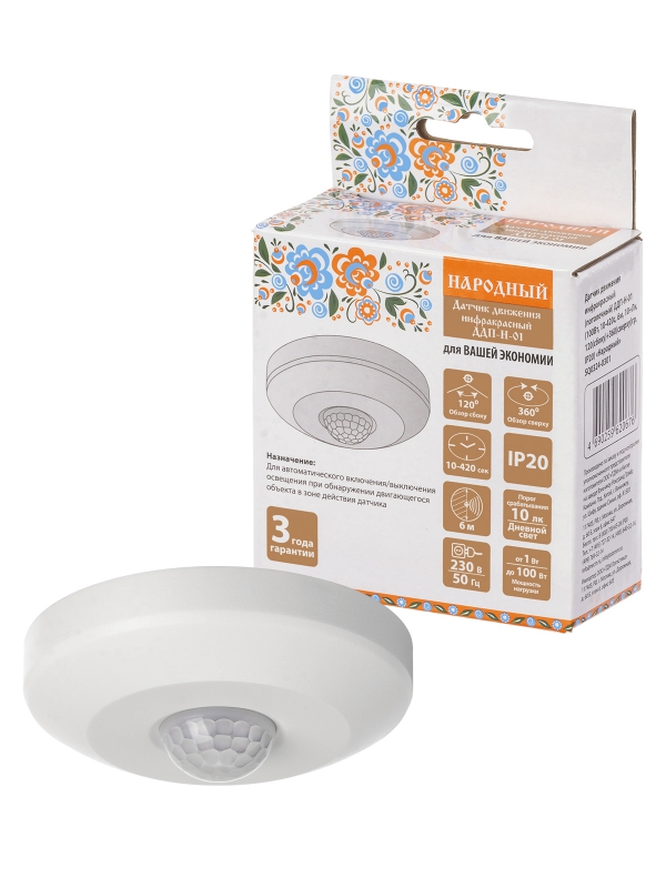 Датчик движения ДДП-Н-01 (100Вт, 10-420с, 6м, 10+Лк, 120(сбоку)+360(сверху)гр, IP20) Народный | код SQ0324-0301 | TDM НАРОДНЫЙ