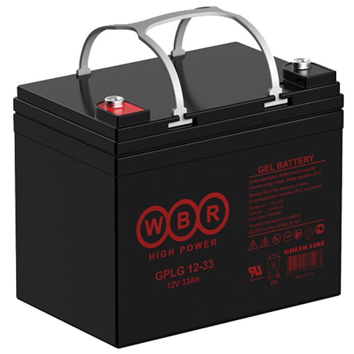WBR GPLG12-33 Гелиевая аккумуляторная батарея для ИБП, напряжение: 12В, ёмкость: 33Ач, клеммы типа: Под болт М6 / Под болт с гайкой М8, Размеры ДШВ: 195x130x167мм, вес: 10,1кг. Срок службы: 12 лет. | код WBR GPLG12-33 | WBR