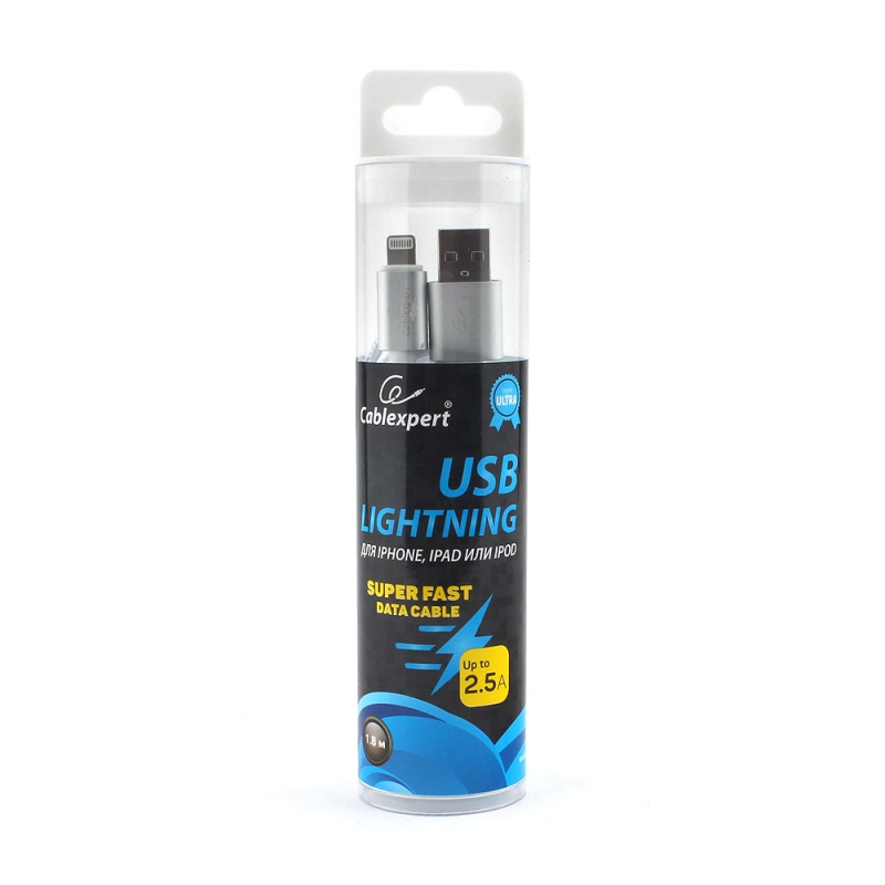 Кабель Cablexpert для Apple CC-U-APUSB01S-1.8M, AM/Lightning, серия Ultra, длина 1.8м, серебристый, блистер | код CC-U-APUSB01S-1.8M | Cablexpert