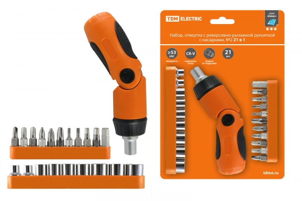 Набор, отвертка с реверсивно-рычажной рукояткой с насадками, №2, 21 предмет Алмаз TDM | код SQ1019-0202 | TDM