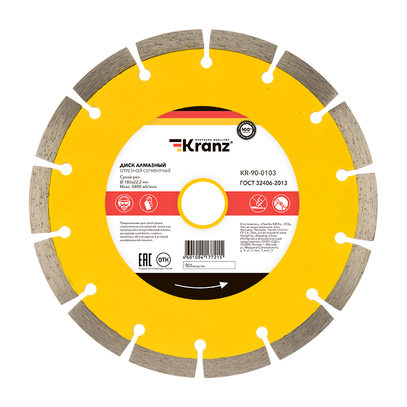 Диск алмазный отрезной сегментный 180x22.2x2.2x10 мм KRANZ | код KR-90-0103 | KRANZ
