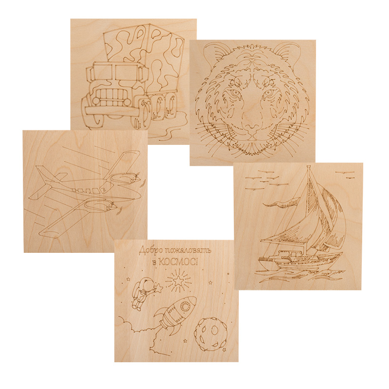 Доски для выжигания REXANT, Для мальчиков , 150х150 мм, набор 5 шт. (Тигр/Самолет/Машина/Парусник/Космос), пакет | код 12-0929 | REXANT