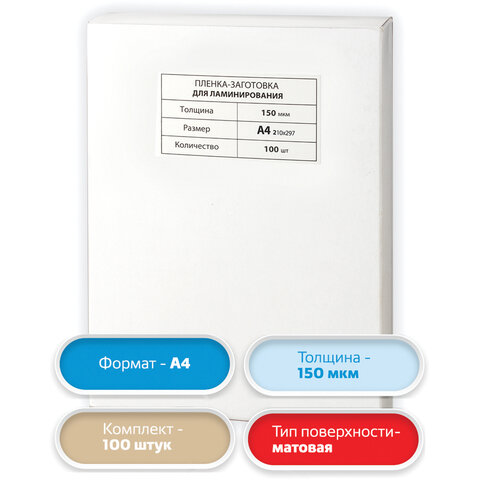 Пленки-заготовки для ламинирования А4, КОМПЛЕКТ 100 шт., 150 мкм, МАТОВАЯ, BRAUBERG | код 531781 | BRAUBERG
