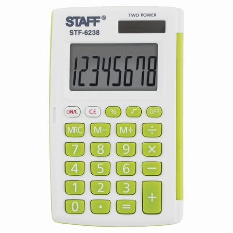 Калькулятор карманный STAFF STF-6238 (104х63 мм), 8 разядов, двойное питание, БЕЛЫЙ С ЗЕЛЁНЫМИ КНОПКАМИ, блистер, 250283 | код 250283 | STAFF