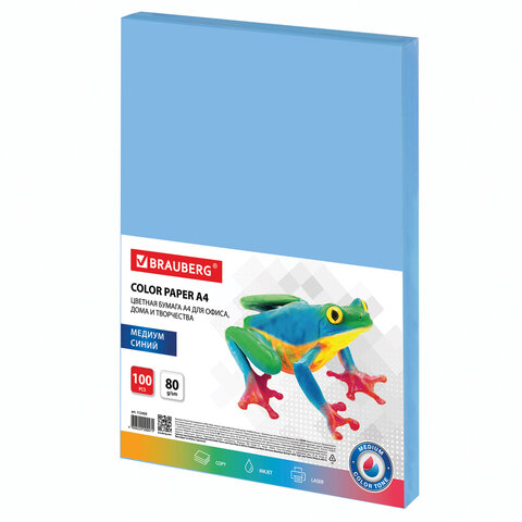 Бумага цветная BRAUBERG, А4, 80 г/м2, 100 л., медиум, синяя, для офисной техники, 112459 | код 112459 | BRAUBERG