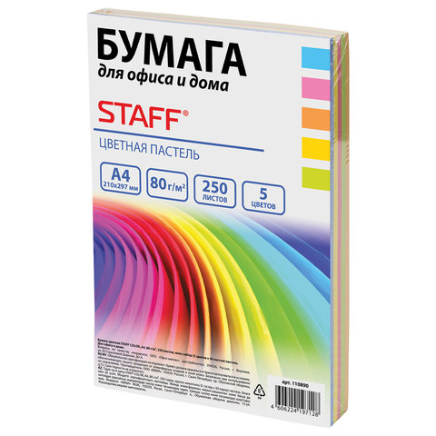 Бумага цветная STAFF COLOR, А4, 80 г/м2, 250 л. (5 цв. х 50 л.), пастель, для офиса и дома, 110890 | код 110890 | STAFF