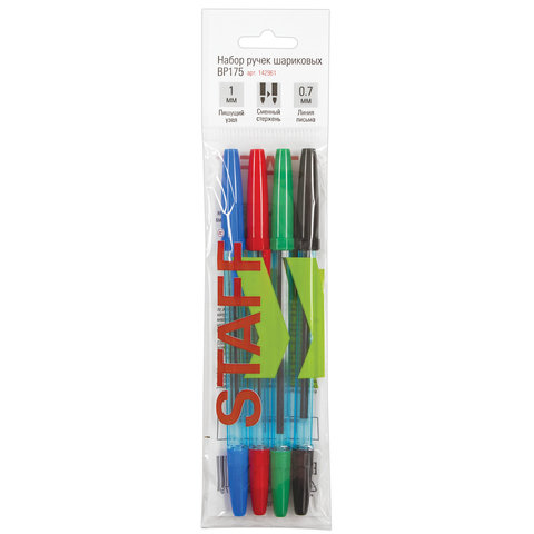 Ручки шариковые STAFF Office, НАБОР 4 шт., (синяя, черная, красная, зеленая), узел 1 мм, линия письма 0,7 мм, 142961 | код 142961 | STAFF