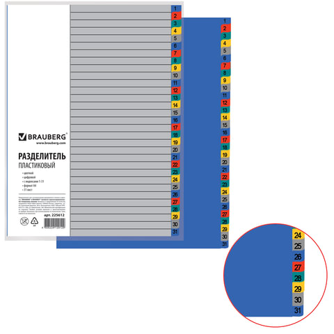 Разделитель пластиковый BRAUBERG, А4, 31 лист, цифровой 1-31, оглавление, цветной, РОССИЯ, 225612 | код 225612 | BRAUBERG