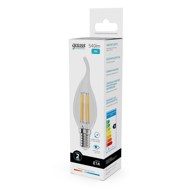 Лампа светодиодная филаментная Filament Elementary 8Вт свеча на ветру 4100К Е14 540лм GAUSS 42128