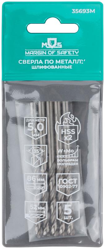 Сверла по металлу HSS шлифованные, угол заточки 135град, 5,0X86 мм (5 шт.) | код 35693М | FIT