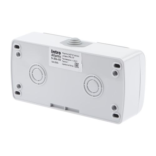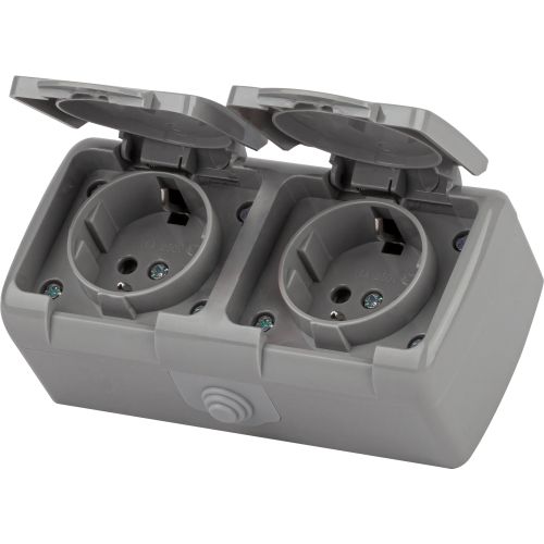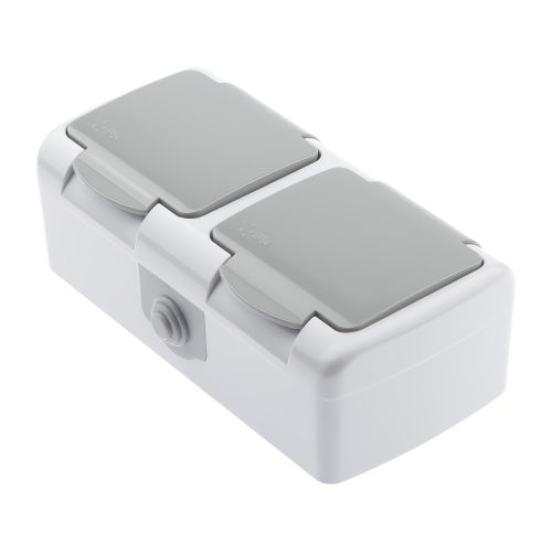 Розетка Intro Atlantic 5-204-03 двойная с заземлением 2х2P+E Schuko шторки, 16А-250В, IP54, открытой установки, серый | код Б0051061 | ЭРА