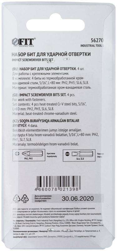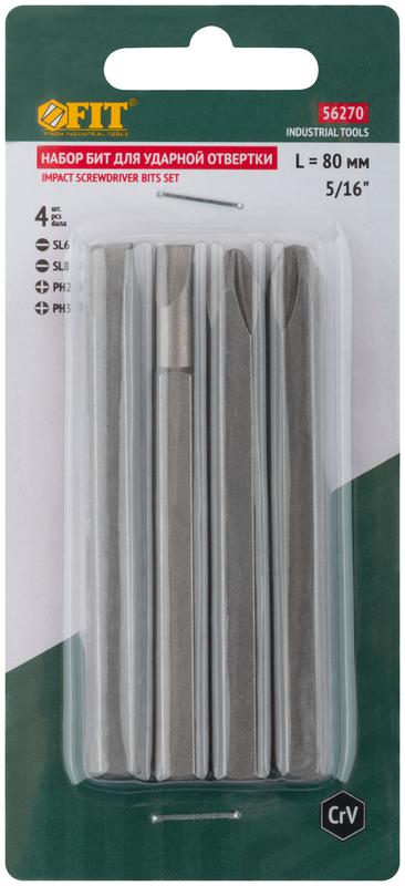 Биты для ударной отвертки CrV набор 4 шт 75 мм | код 56270 | FIT