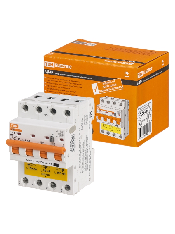 Диф.автомат АД4P 4Р С25 30-100-300мА 6кА тип АС TDM | код SQ0204-0631 | TDM