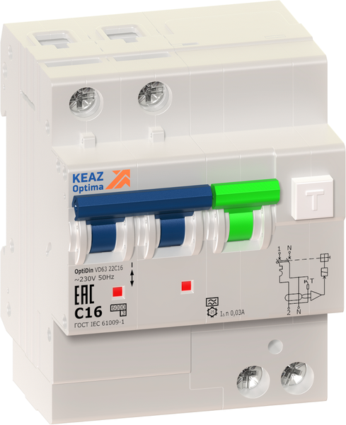 АВДТ с защитой от сверхтоков OptiDin VD63-22C20-A-ОМ4-РЕГ (2P, C20, 30mA) 10кА | код 361295 | КЭАЗ