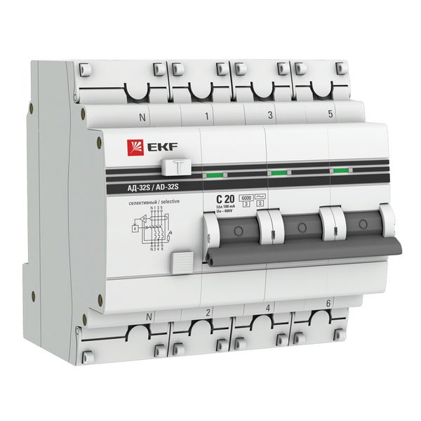 Дифференциальный автомат АД-32 (селективный) 3P+N 20А/100мА EKF PROxima | код DA32-6-20-100S-4P-pro | EKF