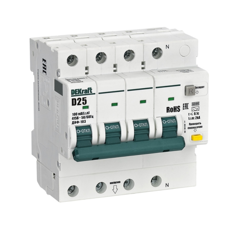 АВДТ 3P+N 25А 100мА AC х-ка D ДИФ-103 6кА | код 16520DEK | DEKraft