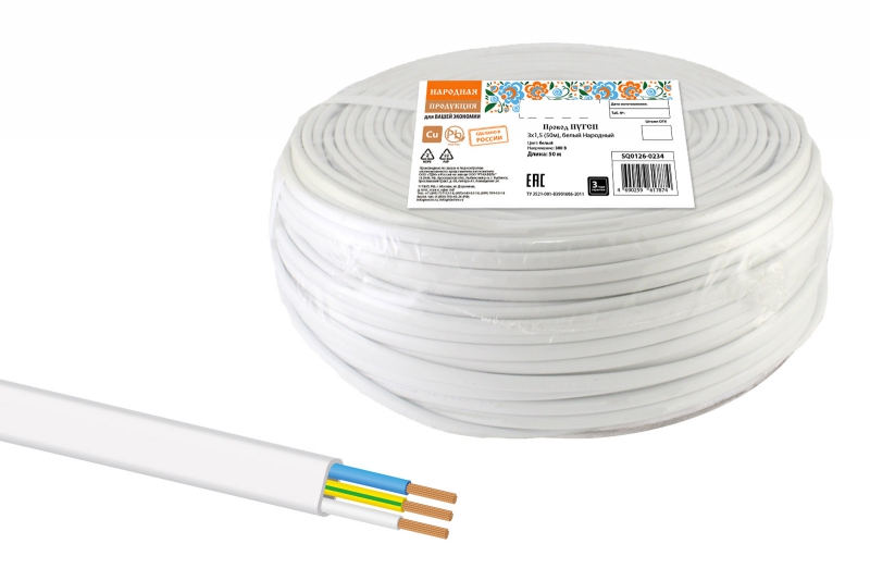 Провод ПУГСП (ПУГНП) 3х1.5 (бухта 50м) белый Народный ТРТС | код SQ0126-0234 | РЭМЗ ТМ