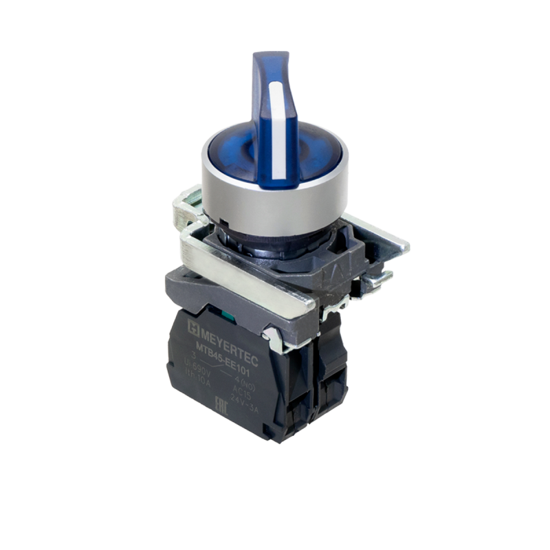 Переключатель на 2 положения с фиксацией и подсветкой, синий, 1NO, 220V AC/DC, IP65, металл MTB4-BK26713 | код 137173 | MEYERTEC