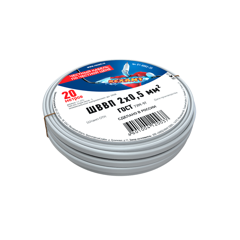Провод ШВВП 2х0,5 мм кв, длина 20 метров, ГОСТ 7399-97 REXANT | код 01-8082-20 | REXANT