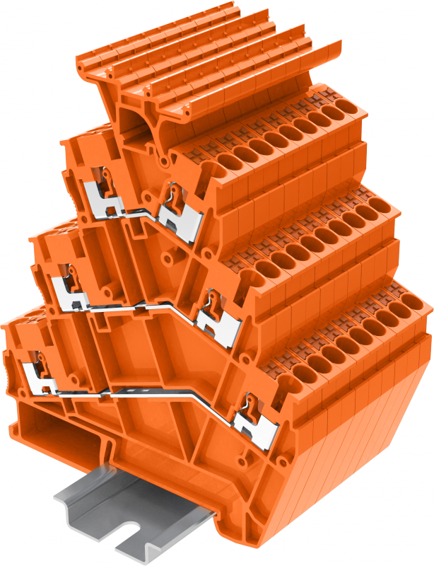 TPTS2.5-2T-OG Клемма TP проходная 3-уровневая угловая с держателем маркировки, Push-in, сеч.2.5мм2, оранж., шт | код TPTS2.5-2T-OG | SUPU