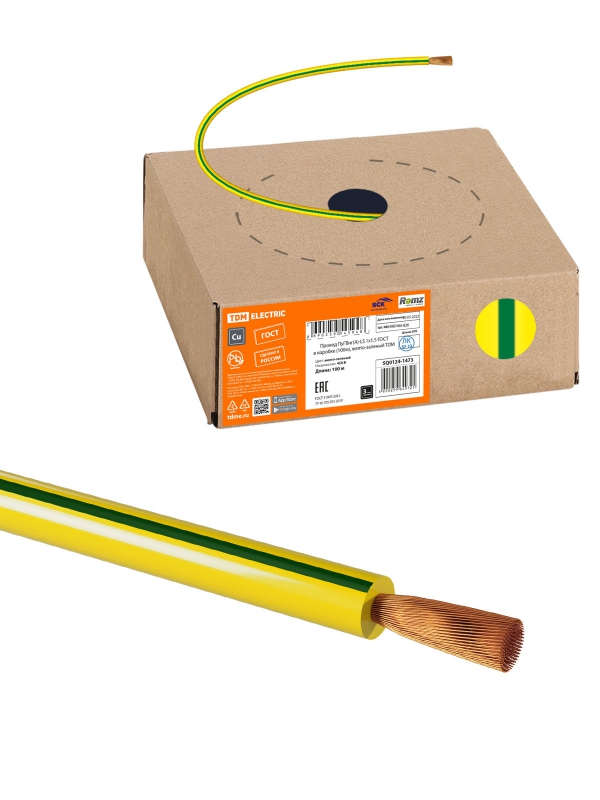 Провод ПуГВнг(А) -LS 1х1.5 ГОСТ в коробке (бухта 100м) желто-зеленый | код SQ0124-1473 | РЭМЗ ТМ
