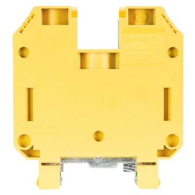 Заземляющая клемма, тип фиксации провода: винтовой, номинальное сечение: 70 мм кв., 800V, ширина: 24 мм, цвет: желто-зеленый, тип монтажа: DIN 35 | код 57.570.9055.0 | Wieland