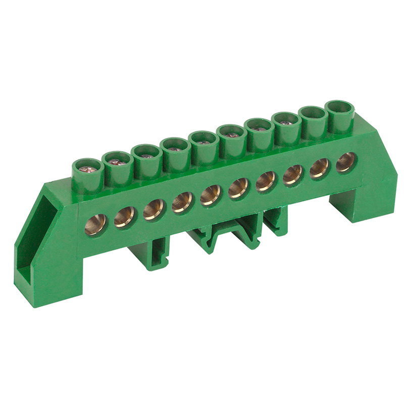 Шина PE земля в комбинированном зеленом изоляторе на DIN-рейку 6x9 мм 10 групп REXANT | код 11-2308 | REXANT