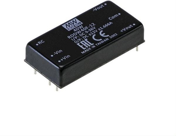 Источник питания DC-DC, 40Вт, вход 48В (18…75В) DC, потребление без/под нагр. 15мА/1000мА, выход ±12В/0...±1666мА, КПД 90%, ёмкостная нагр. макс. 2600мкф, изоляция 1600В DC, в корпусе 50,8х25,4х10,5мм, -40…+90С | код RDDW40G-12 | MeanWell С