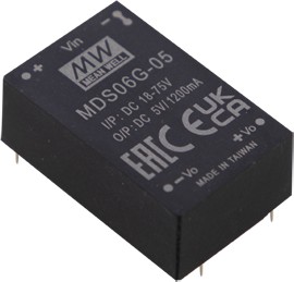 Источник питания DC-DC, 6Вт, вход 24,48В (18…75В) DC, потребление без/под нагр. 12мА/305мА, выход 12В/500мА, КПД 84%, ёмкостная нагр. макс. 120мкф, изоляция 6000В DC/4200В AC, в корпусе 31.8х20.3х12.2мм, -40…+90С | код MDS06G-12 | MeanWell