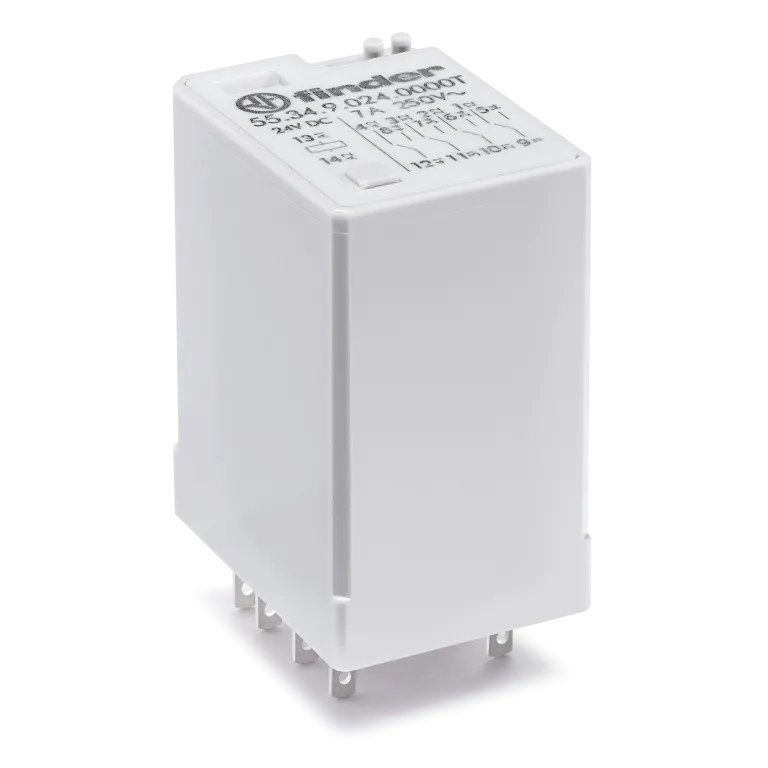 Миниатюрное универсальное электромеханическое реле, монтаж в розетку, 4CO 7A, контакты AgNi, катушка 230В АC, степень защиты RTI, опции: нет, специальная версия для Ж/Д-транспорта | код 553482300000T | FINDER