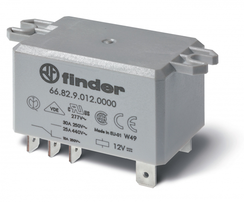 Силовое электромеханическое реле, монтаж в наконечники Faston 250 (6.3x0.8мм), 2NO 30A, контакты AgNi, катушка 110В DC, степень защиты RTII, УХЛ4, монтажный фланец, опции: нет | код 668291101300 | FINDER