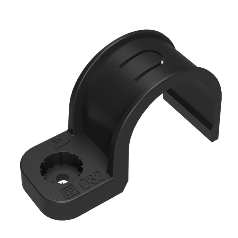 Крепеж-скоба пластиковая односторонняя для прямого монтажа атмосферостойкая черная в гофроящике d32 мм (350шт/кор) Промрукав | код PR13.02550 | ПРОМРУКАВ