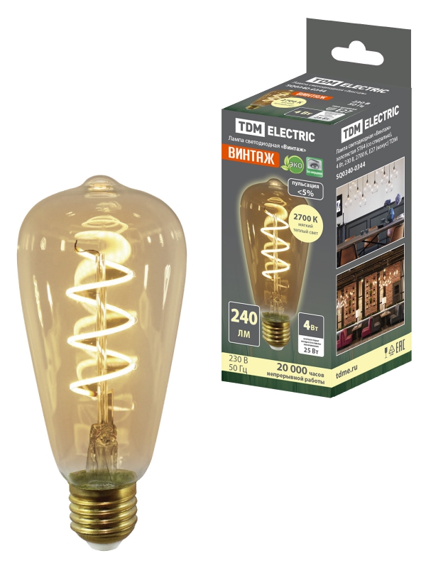 Лампа светодиодная «Винтаж» золотистая ST64 (со спиралью), 4 Вт, 230 В, 2700 К, E27 (конус) TDM | код SQ0340-0344 | TDM