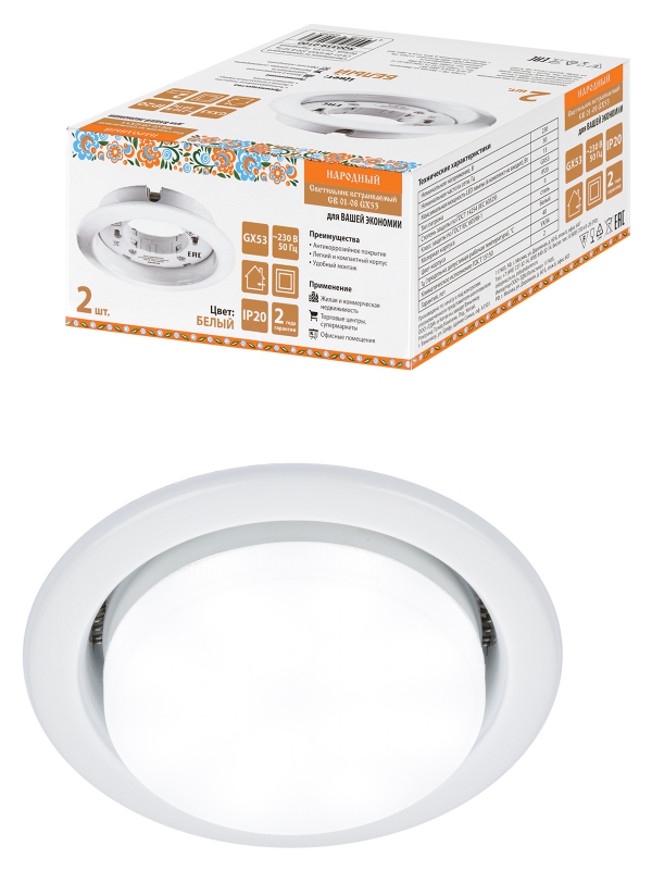Светильник встраиваемый СВ 01-08 GX53 220 В 50 Гц, белый, 2 шт/уп, Народный | код SQ0359-0100 | TDM НАРОДНЫЙ