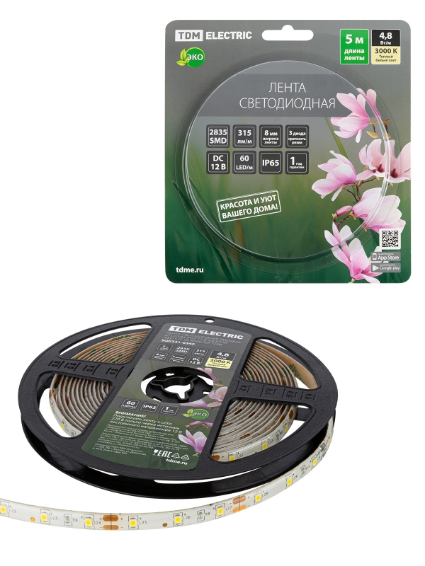 Лента светодиодная SMD2835-60 LED/м-IP65-12 В-4,8 Вт/м-3000 К (5 м) блистер TDM | код SQ0331-0340 | TDM