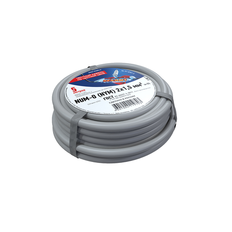 Кабель силовой медный NUM-O 2x1,5 мм кв, длина 5 метров, ГОСТ 31996-2012, ТУ 3520-015-38229892-2015 REXANT | код 01-8701-5 | REXANT