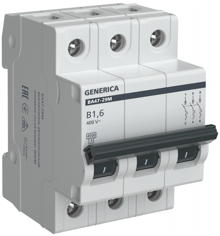 Авт. выкл. ВА47-29М 3P 1,6А 4,5кА B GENERICA | код MVA21-3-D16-B-G | GENERICA by IEK
