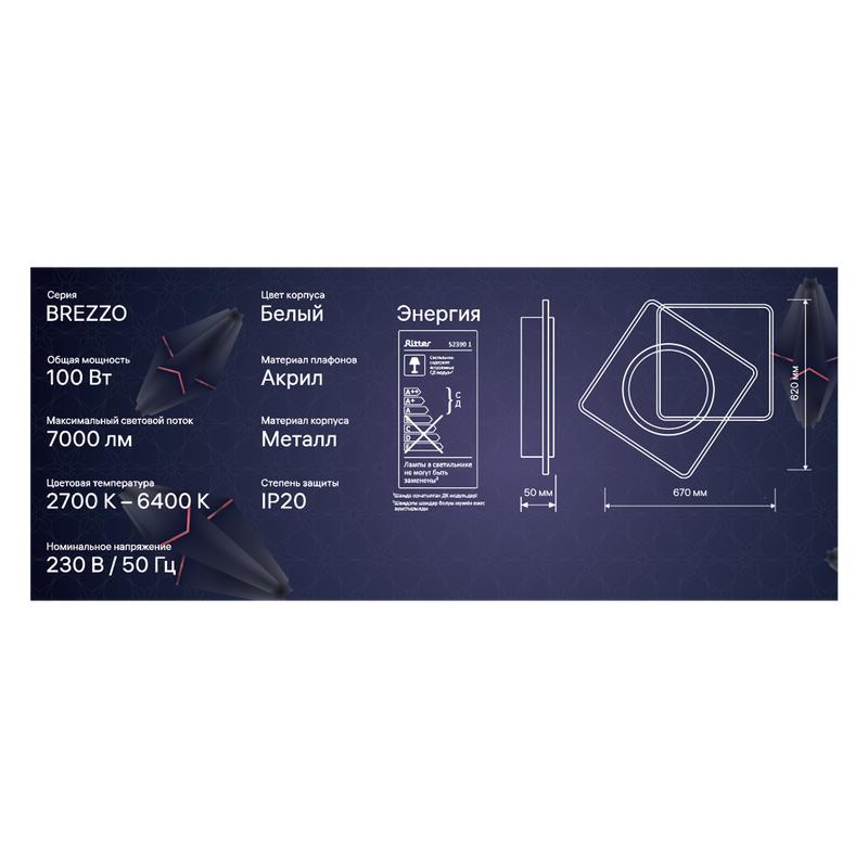 Люстра светодиодная BREZZO 100Вт 755х600х50мм 44кв.м потолочная ДУ 3 режима диммир. бел. Ritter 52390 1