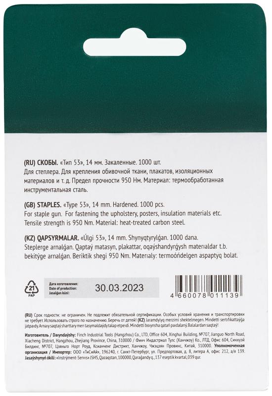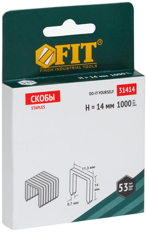 Скоба для степлера закаленные прямоугольные 11.3ммх0.7мм (узкие тип 53) 14мм (уп.1000шт) FIT 31414