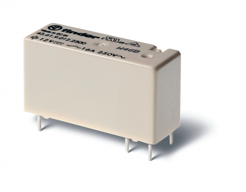 Низкопрофильное миниатюрное электромеханическое реле, монтаж на печатную плату, выводы с шагом 5мм, 1NO 16A, контакты AgCdO, катушка 24В DС, влагозащита RTIII | код 436190242301 | FINDER
