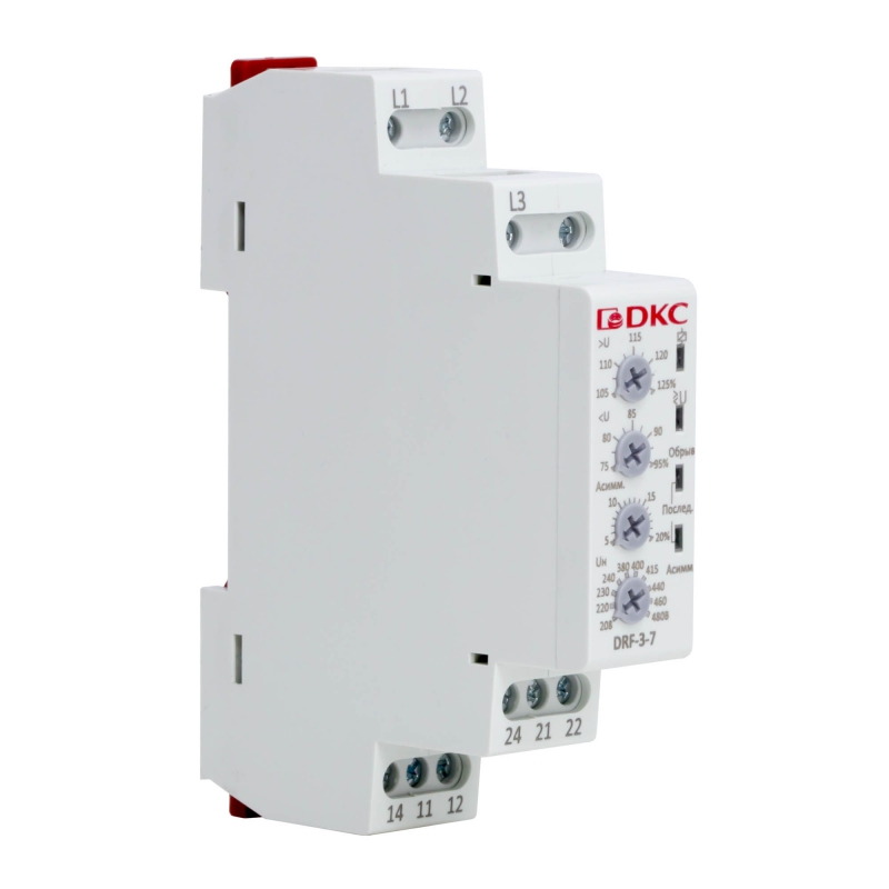 Реле контроля фаз, 3 фазы, тип DRF, контроль напряжения , контроль обрыва фаз, котроль чередования фаз, контроль асимметрии, конфигу | код DRF-3-7 | DKC