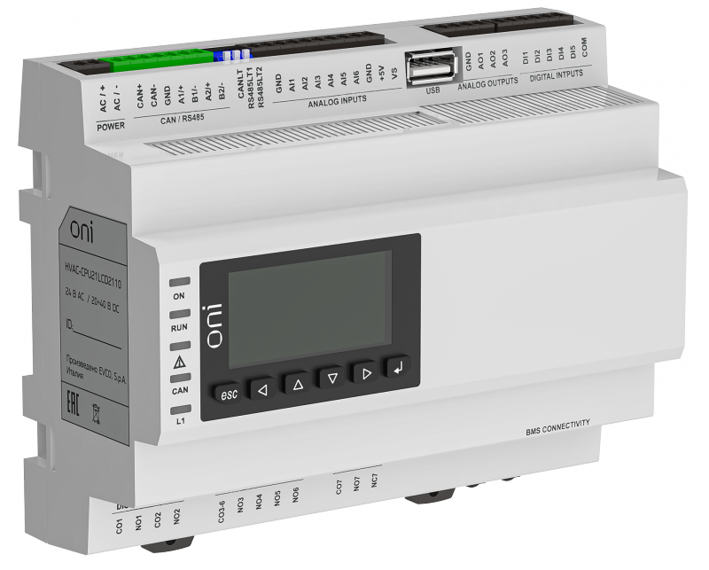 ПЛК для HVAC систем модуль ЦПУ с 5DI 7DO 6AI 3AO LCD экраном 2 портами RS485 и 1 портом Ethernet память для программ пользователя 1Мб ONI | код HVAC-CPU21LCD2110 | ONI